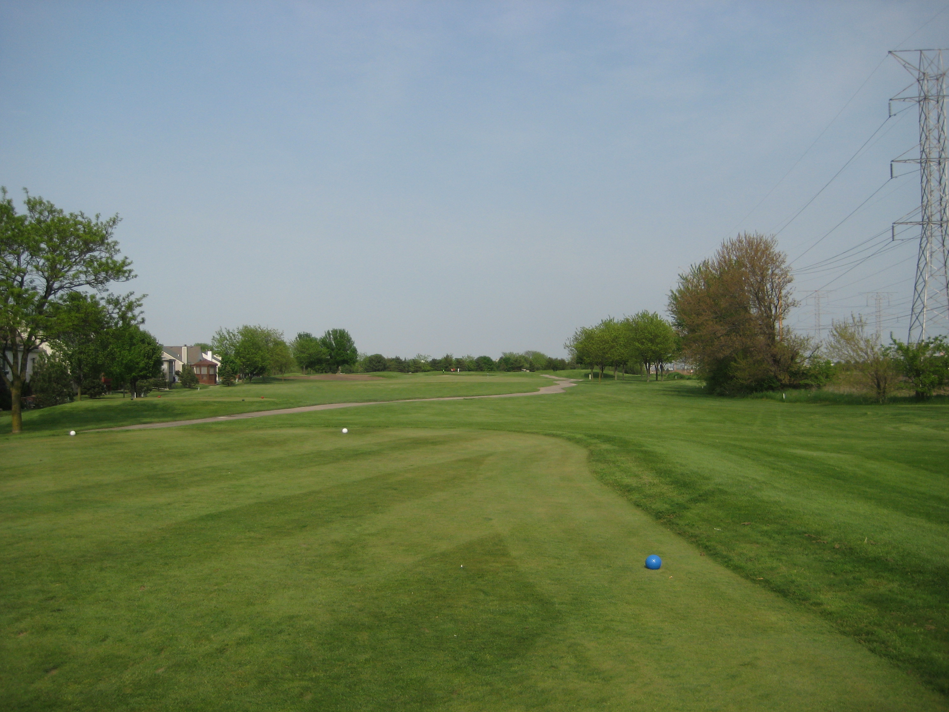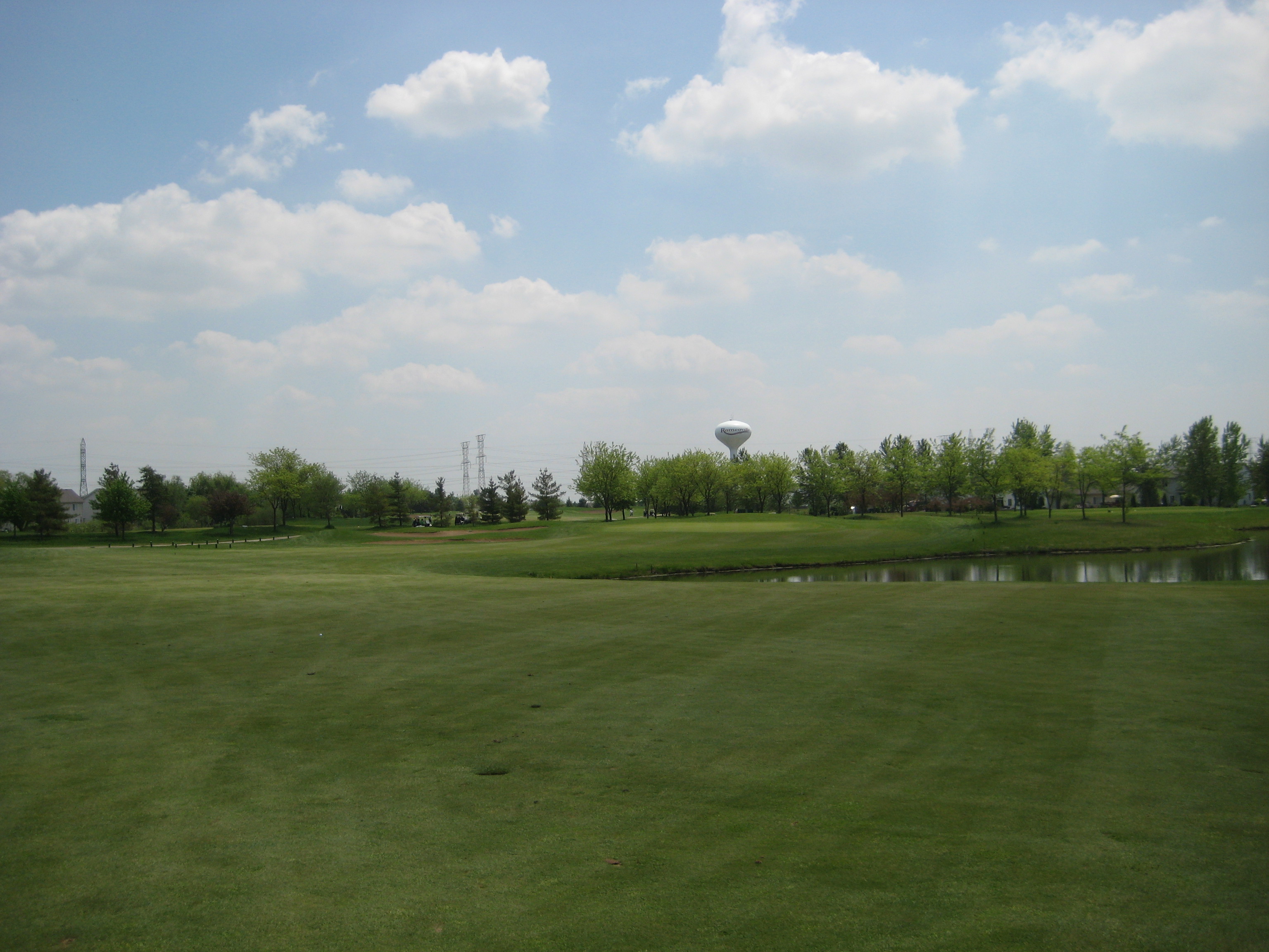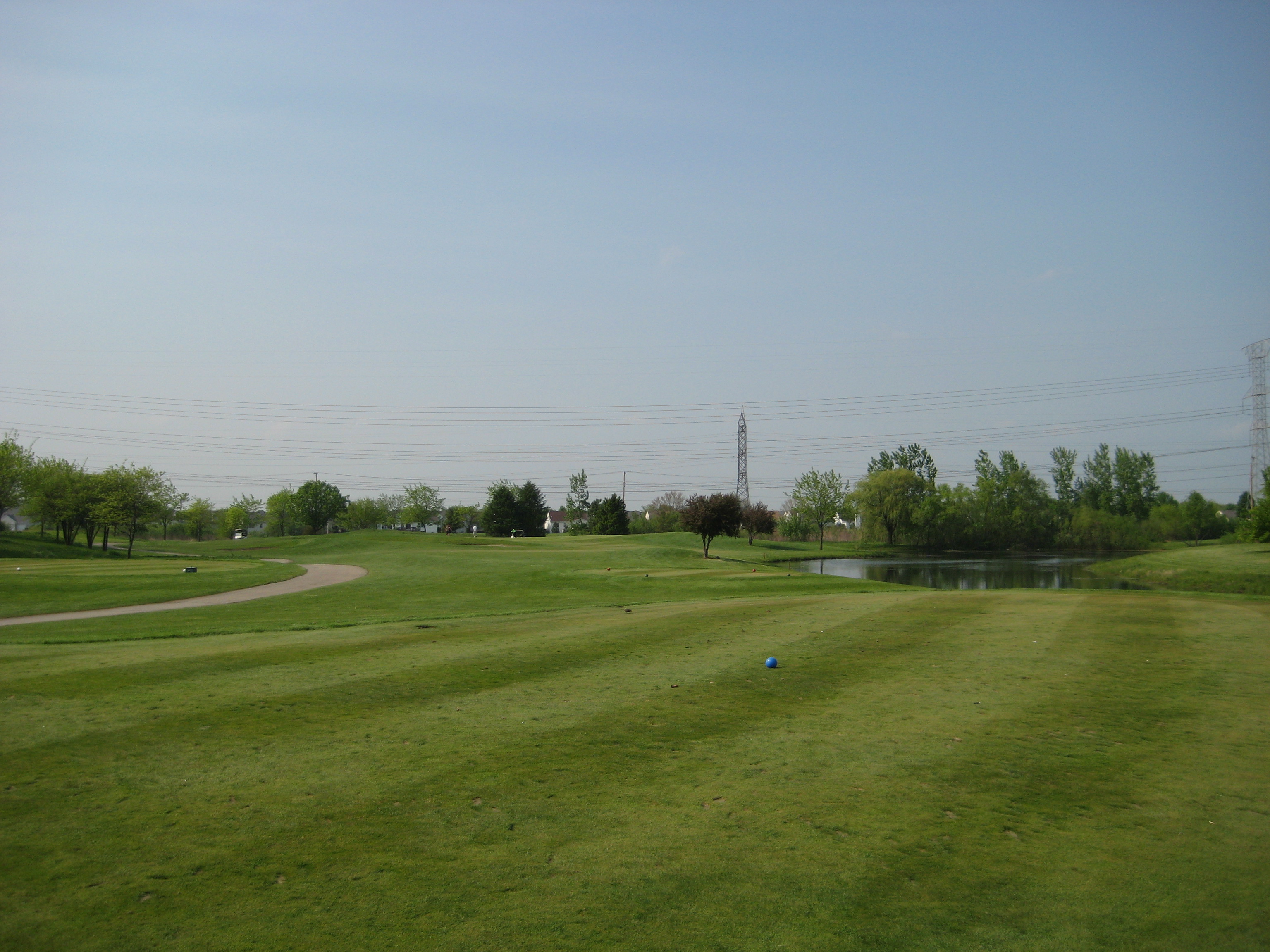 3rd Hole: Par 4, 419yds. Take your drive right in between the power lines you see below and you will be in great position for your approach. There is water straight ahead towards the white water tower and a big drive could get you into trouble if you take that line. Second pic is from the 150yds stick.